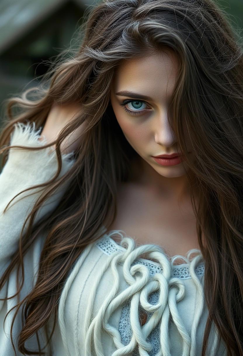Fashion photography of a A woman with long,flowing brown hair and blue eyes gazes intently at the viewer. Her fur is made of soft white curls,and she wears an expressive white singlet that contrasts with the stark hues of emerald green. fashion photography,dark fantasy,f/1,scenes of rural life,whimsical themes,organic and flowing designs,cinematic perfect intricate stunning fine detail,magic atmosphere,fertile,elaborate,