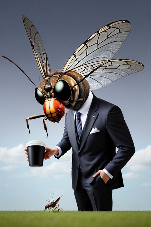 Absurd photo montage, portrait of a giant insect, giant fly, wearing a hat, wearing a suit, drinking coffee, photoshop composite