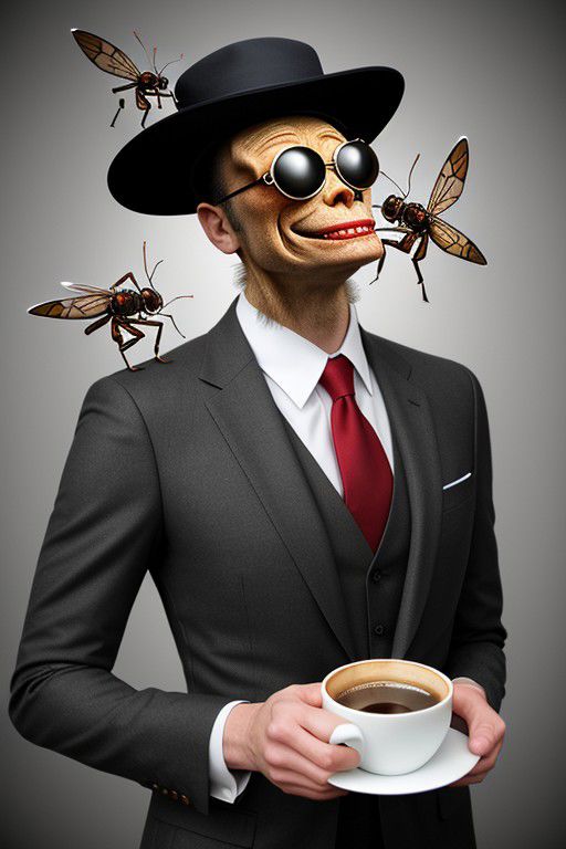 Absurd photo montage, portrait of a giant insect, giant fly, wearing a hat, wearing a suit, drinking coffee, photoshop composite, tiny human angels flying around