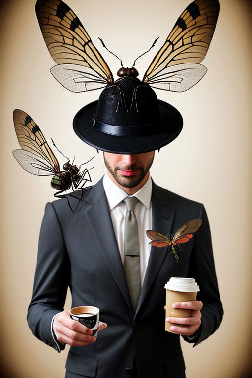 Absurd photo montage, portrait of a giant insect, giant fly, wearing a hat, wearing a suit, drinking coffee, photoshop composite, tiny human angels flying around
