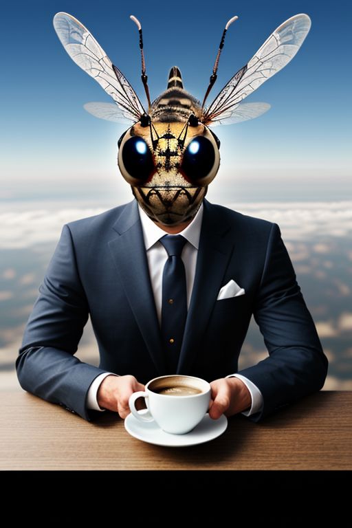 Absurd photo montage, portrait of a giant insect, giant fly, wearing a hat, wearing a suit, drinking coffee, photoshop composite, tiny human angels flying around