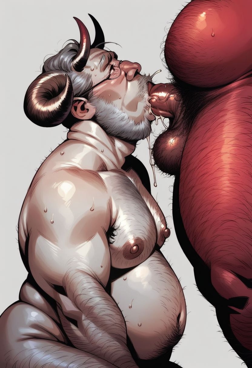 score_9, score_8_up, score_7_up, score_6_up, male grandpa demon (old_man, mature, ugly man, red skin, horns, gray hair, large pecs, fat belly, wide hips, doublechin, big hairy balls, hairy arms, fat hairy chest, hairy legs, precum dripping fat penis), white man (pale skin, blond hair), kneeling, deepthroat, balls deep, excessive cum, on cloud