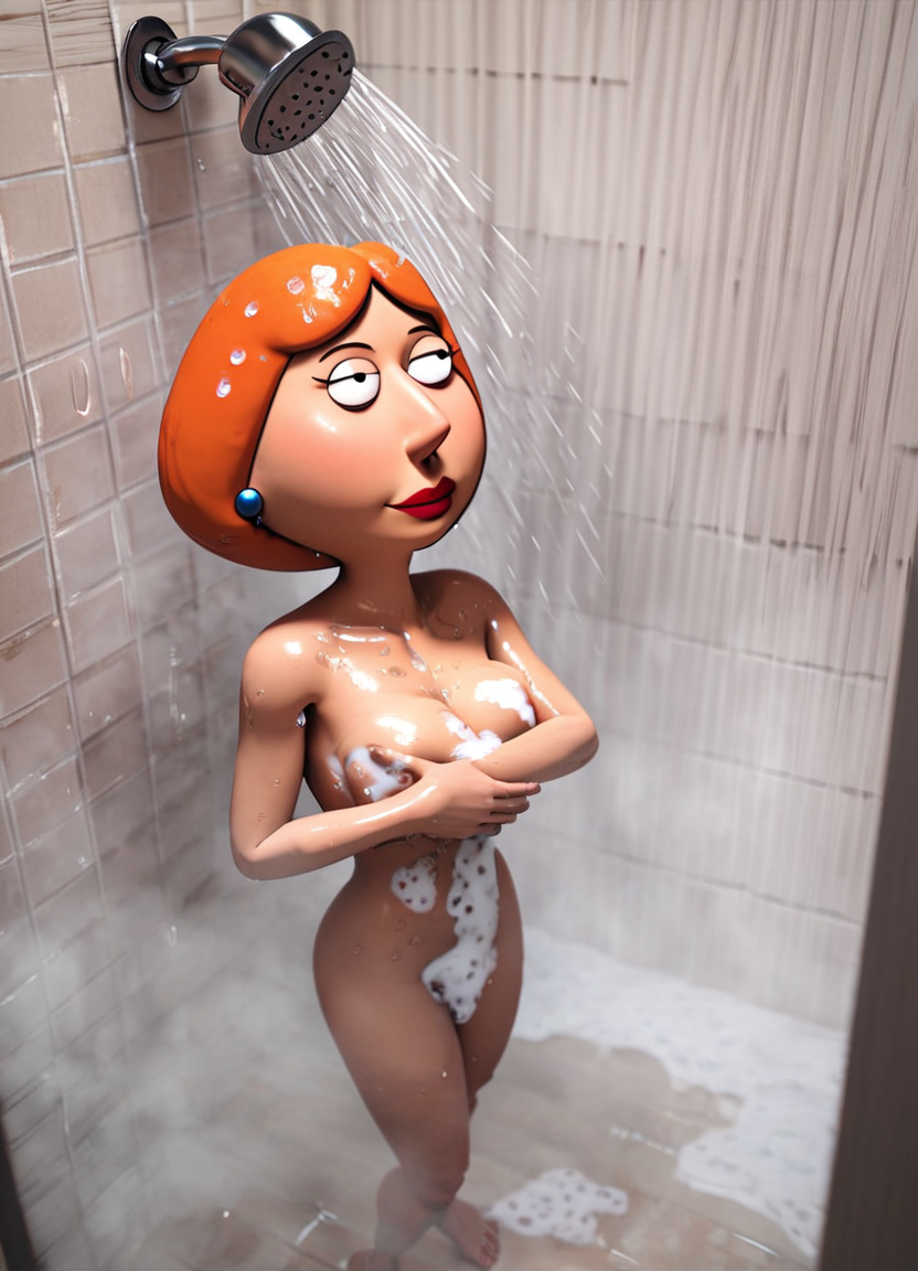 score_9, score_8_up, score_7_up, loisgriffin, 1girl, ultra-realistic, 3d, orange-hair, in the bathroom, showering, water, wet, lather covered, soapy, steam, from above, covering her breasts, <lora:LoisGriffin-PonyXL:0.8>