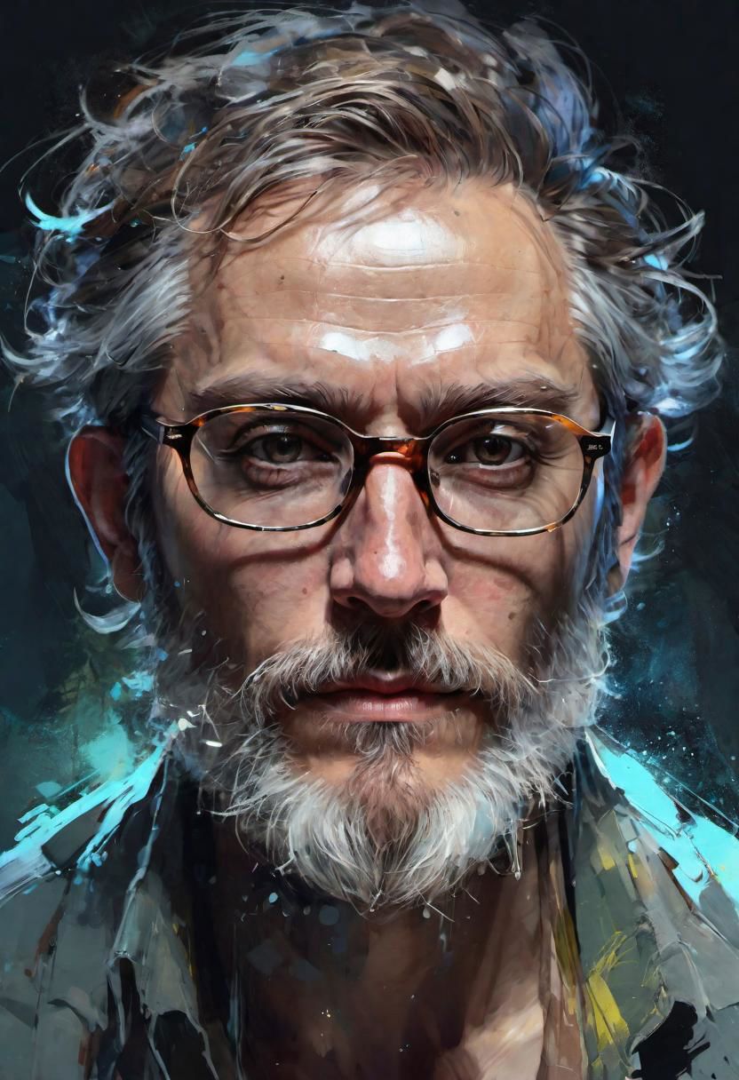 abstract handsome gray bearded with glasses, centered, looking at the camera, approaching perfection, dynamic, moonlight, highly detailed, digital painting, artstation, concept art, smooth, sharp focus, illustration, art by Carne Griffiths and Wadim Kashin