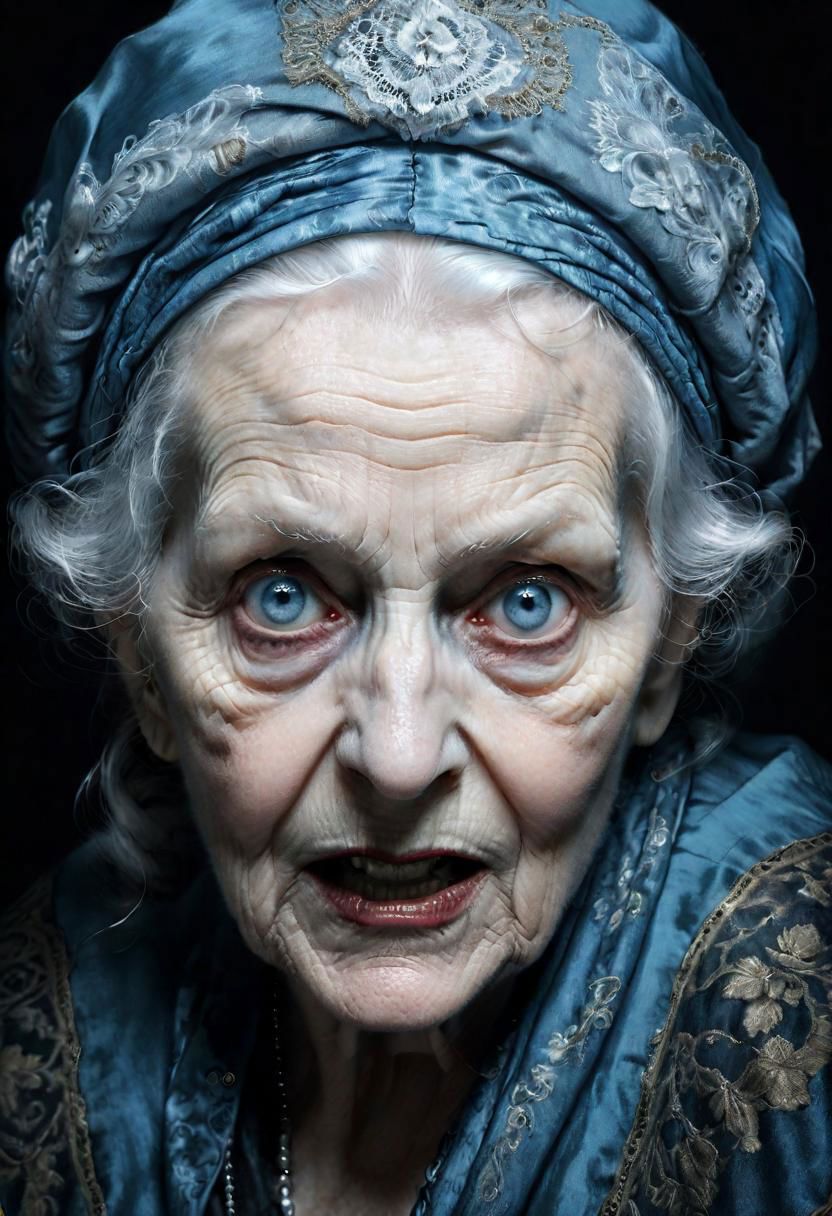 Menacing creepy old lady ghost, black background, white pupil eyes, blue-grey lighting on the face, close-up, horror, dark and haunting, hyperrealism, ultra-detailed, high quality textures, Rembrandt style, Roberto Ferri style
