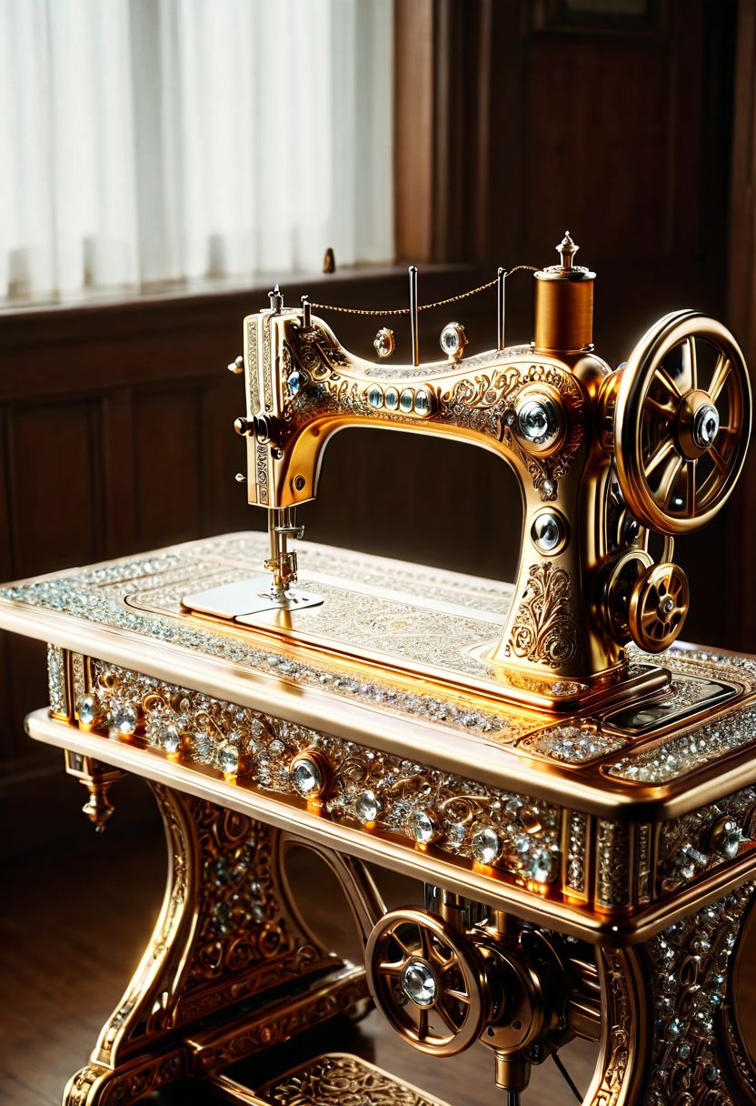 there is a sewing machine sitting on a table in a room, retro machinery, steampunk aesthetic, intricate machinery, highly ornate, antiques, a long-shot, antique style, beautiful craftsmanship, ultra intricate, manufactured in the 1920s, early xx century technology, very ornate, machinery, steampunk machinery, exquisitely ornate, captivating and enticing, JuggernautNegative, Movie Still, Film Still, Cinematic, Cinematic Shot, Cinematic Lighting, ral-bling,