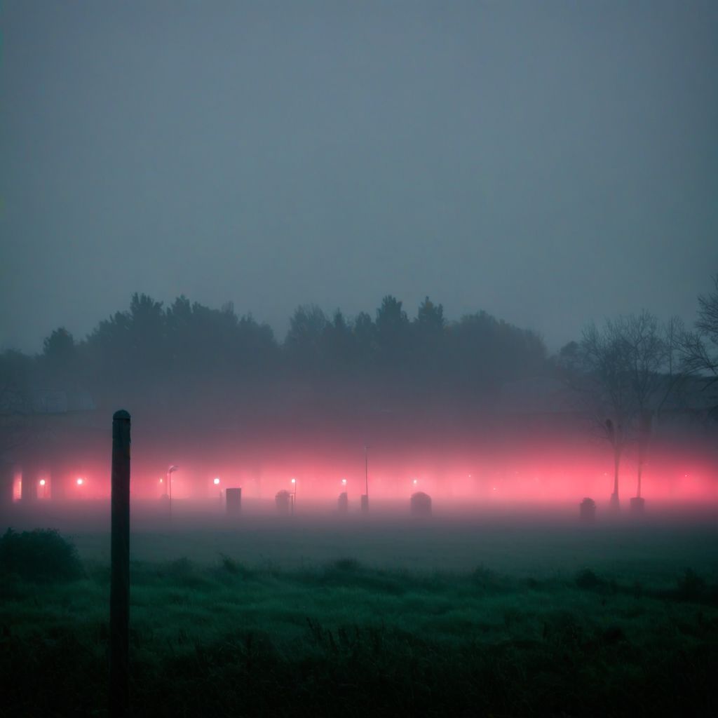 red theme, rural town, gray-green fog, black buildings, luminescence, ((bokeh)), minimalist