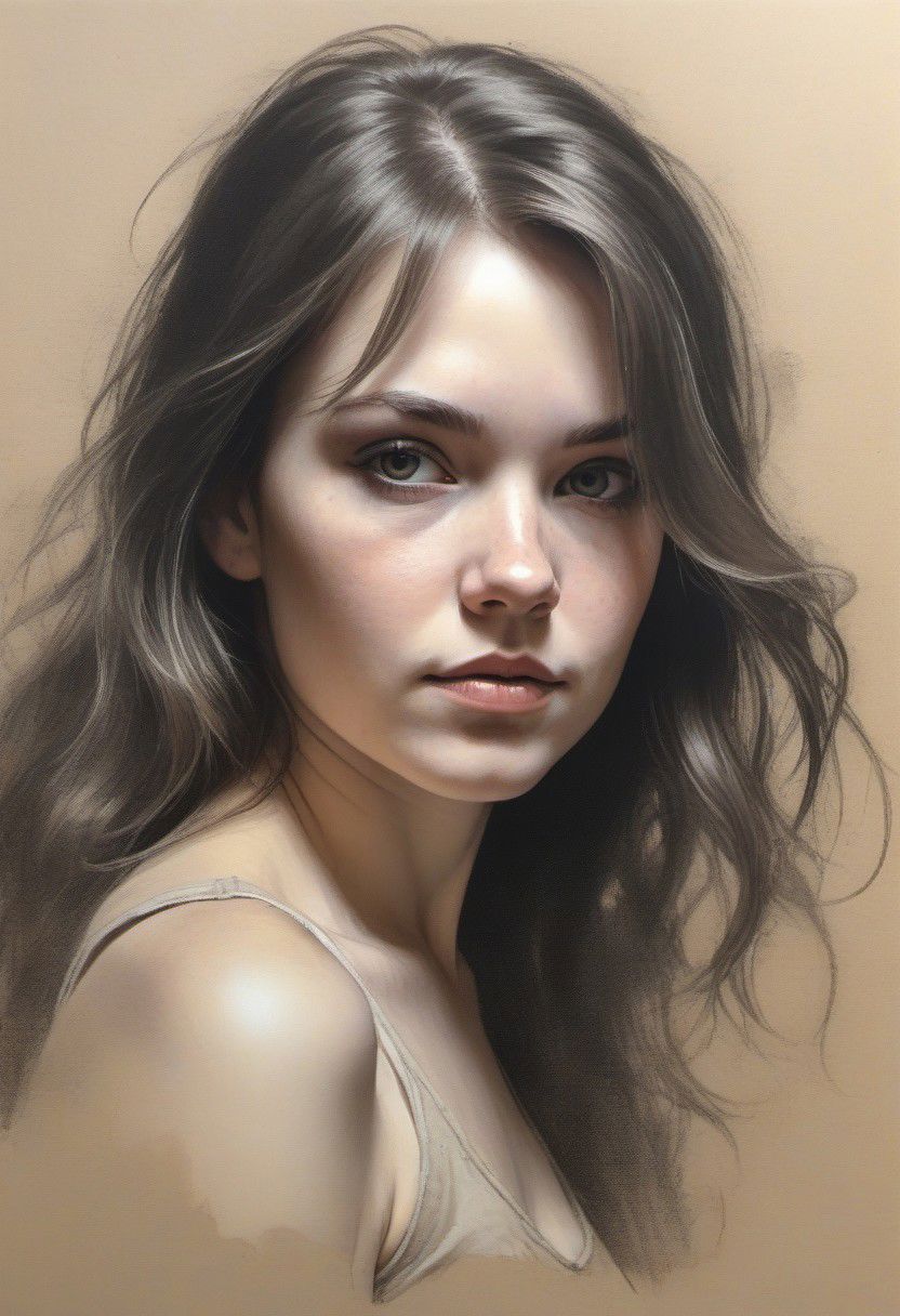 Close-up, high quality, masterpiece, 8k, hdr, rgb, portrait, raw photo, bright rich colors, (masterpiece, best quality, detail), rough charcoal drawing, beautiful girl, light beige paper, stain, rough shading, inspiration, Greg Rutkowski, Craig Davison, Jenny Saville, Bernie Wrightson, Frank Frazetta,