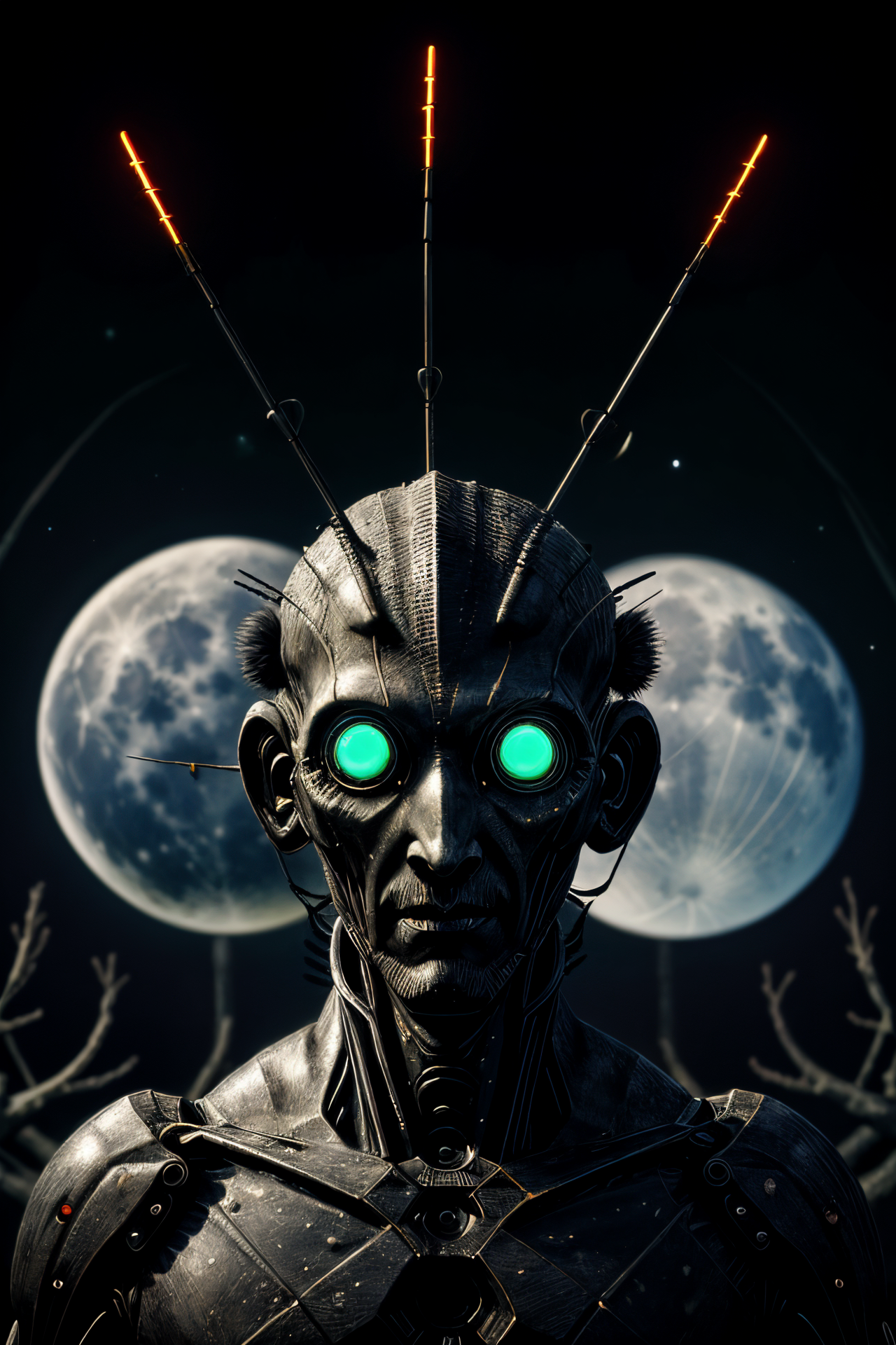 A strange animal in the night of an alien world with 3 moons stalks through a phosphorescent forest. Its segmented body gleams with bioluminescent markings, while multiple eyes glint from a head adorned with shimmering, feather-like antennae. <lora:LORA-XenoDetailer-v3A:2>