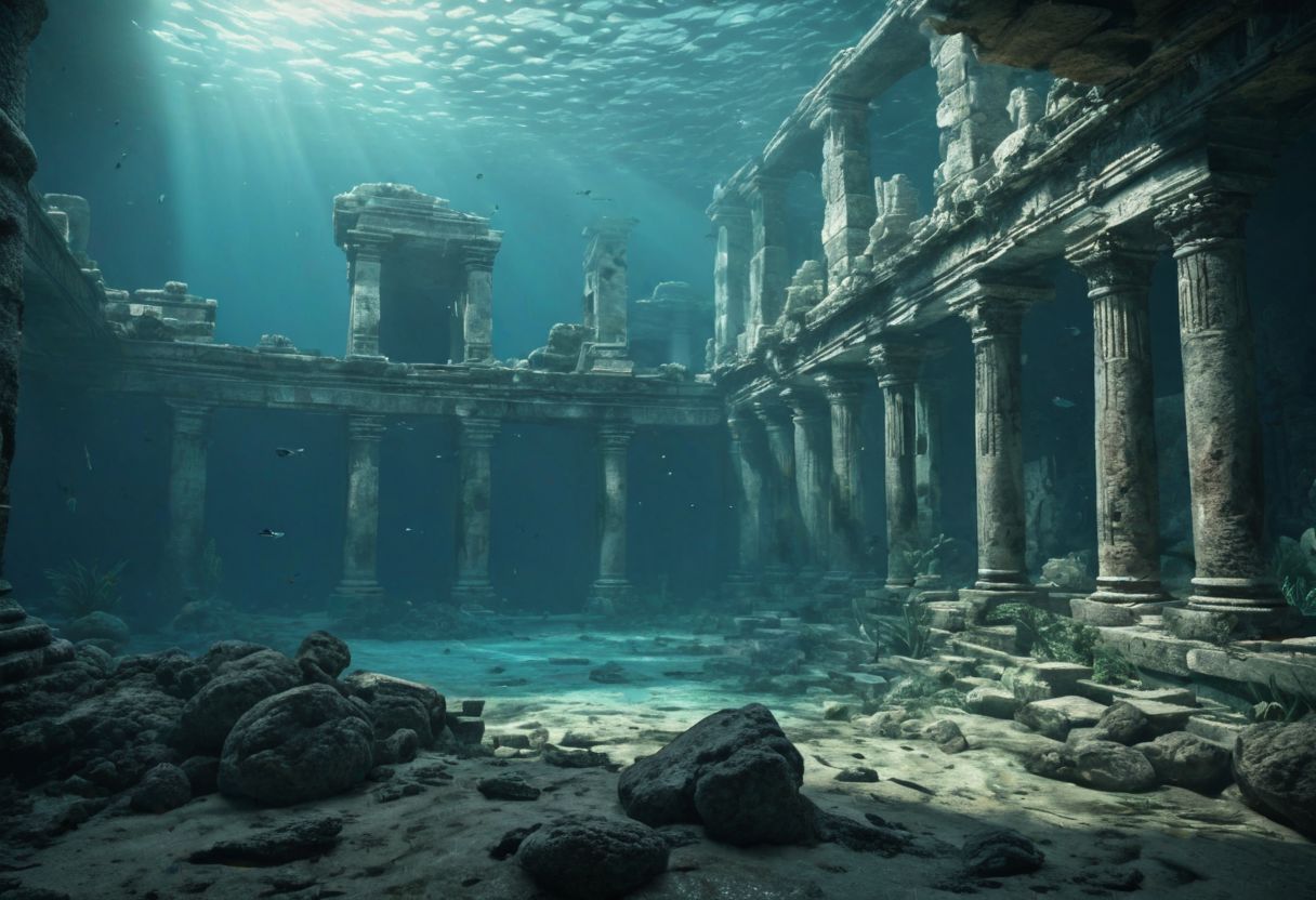 ancient ruins underwater, (in the distance, from afar), abyss, highly detailed, photo realistic, realism, raw photo
