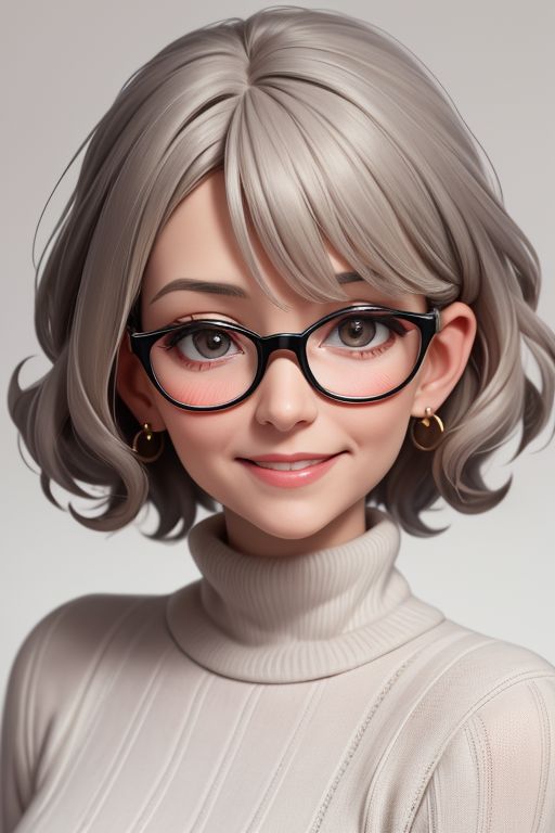 woman, age 65 years old, short curly grey hair, small round black rimmed glasses, smile, turtlen_neck jumper, portrait, (masterpiece, best quality, highres), very big ears, very large big nose, wrinkled skin