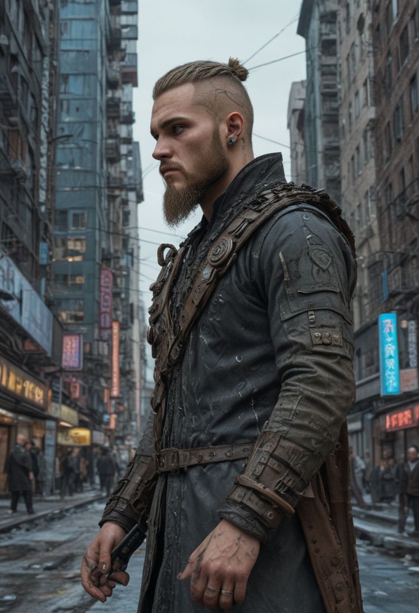 ragnar lothbrok in a cyberpunk cityscape in the style of circural, speckled, <lora:sdxl_lightning_8step_lora.safetensors:1.0>, <lora:add detail xl.safetensors:1.5>,