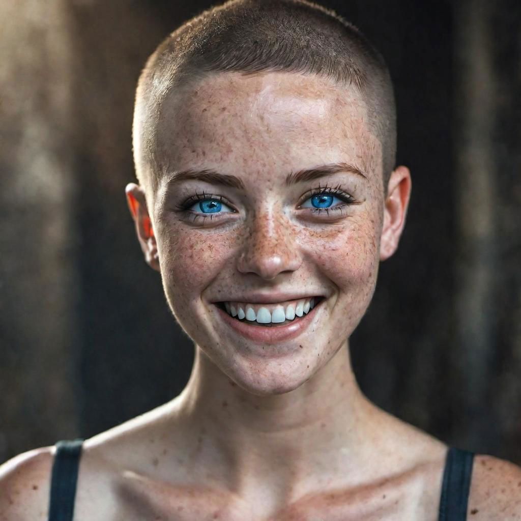 beautiful lady, (freckles), big smile, blue eyes, buzzcut hair, dark makeup, hyperdetailed photography, soft light, head and shoulders portrait, cover as laracroft