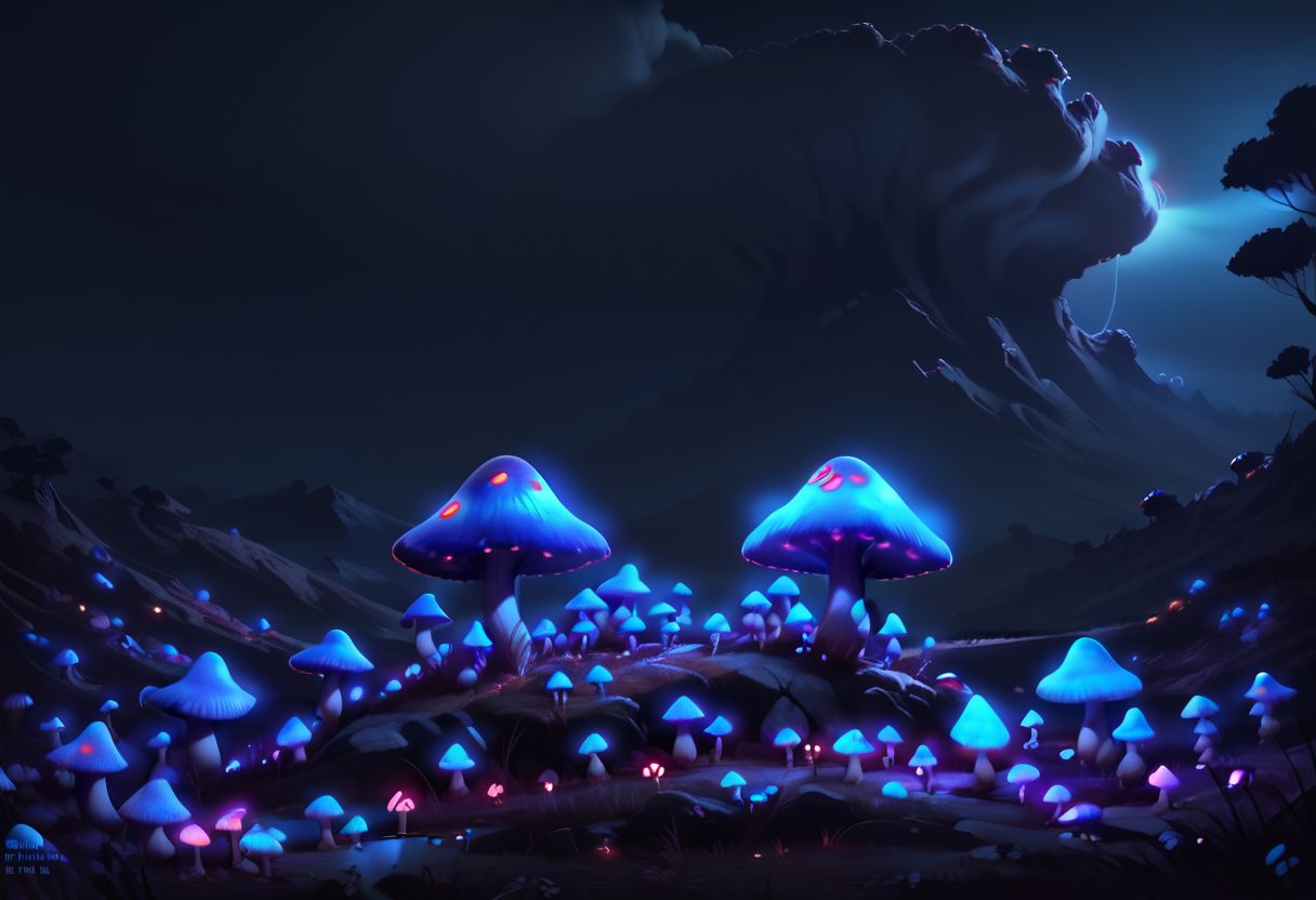 score_9, score_8_up, score_7_up, concept art, realistic, absurd res, 4k, cinematic, dark theme, low light, at night, dark cloudy sky, landscape, huge river, moving water, motion blur, water glowing with blue algae, land with tall grass on either side, small stone arch bridge far away in the distance, large bioluminescent (colorful:1.5) glowing mushrooms lighting the landscape, (huge red glowing translucent mushrooms:1.5), (small blue mushrooms, translucent:1.5), (small orange mushrooms, multi-colored mushrooms, translucent:1.5), (full of mushrooms:1.5), canal and mushrooms are the main focus of the image, vibrant colors,