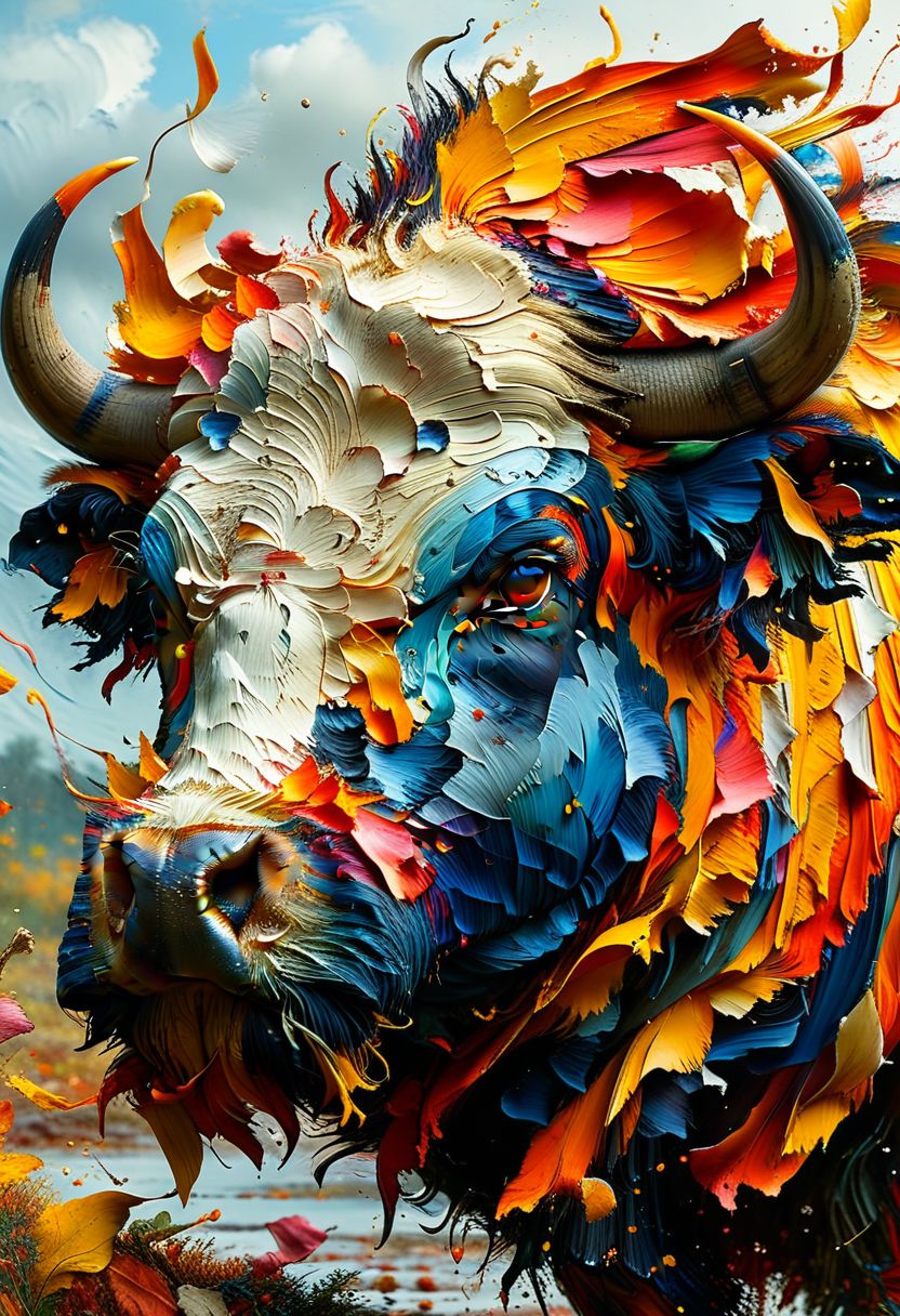 This vibrant, eye-catching image presents a captivating and boldly stylized depiction of a buffalo or bull. The use of vivid, contrasting colors - the fiery orange and red hues against the rich, earthy tones of the animal's fur - creates a striking, almost electric visual impact. The expressive, almost impressionistic brushwork lends a sense of movement and energy to the composition, giving the impression that the animal is alive and dynamic on the canvas. The bold, abstract patterns and textures that cover the buffalo's body add an intriguing layer of visual interest and depth. The centered composition, with the buffalo's head and horns filling the frame, draws the viewer's attention directly to the powerful, intense gaze of the animal. This direct eye contact creates a sense of engagement and connection between the viewer and the subject, inviting contemplation and interpretation. The overall impression is one of raw, primal power and energy, suggesting themes of strength, resilience, and the untamed essence of the natural world. This image could serve as a highly versatile prompt for a range of creative endeavors, from written narratives and poetic explorations to further artistic interpretations in various media. The vibrant, almost hallucinatory quality of the colors and the dynamic, . ral-drptpl
