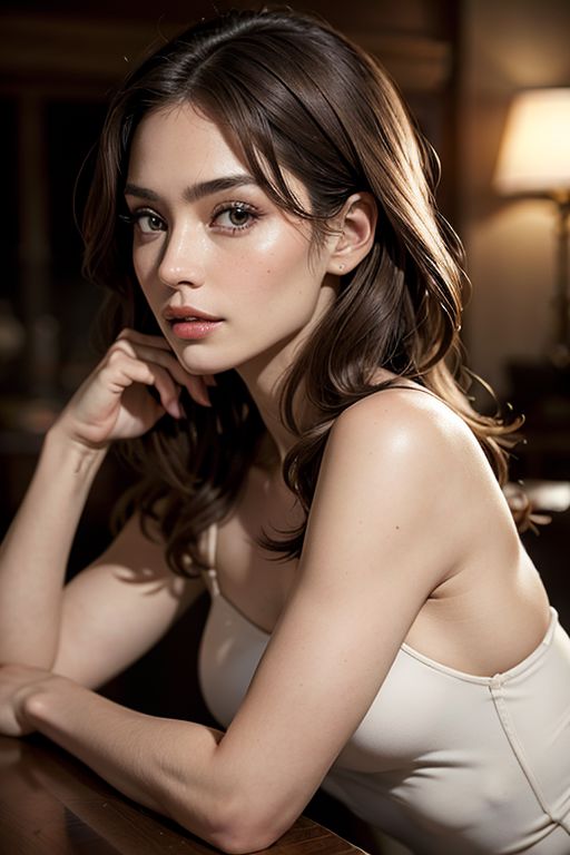 Create a portrait of a woman with captivating doe-like eyes that are a rich shade of chestnut brown, with a subtle golden ring around the iris. Her eyes should have a soft, rounded shape, with delicately arched brows that accentuate their beauty. Give her lips a unique heart-shaped contour, with a fullness that adds to their sensual appeal. Define her jawline to be gracefully tapered, with a gentle curve that highlights her feminine features