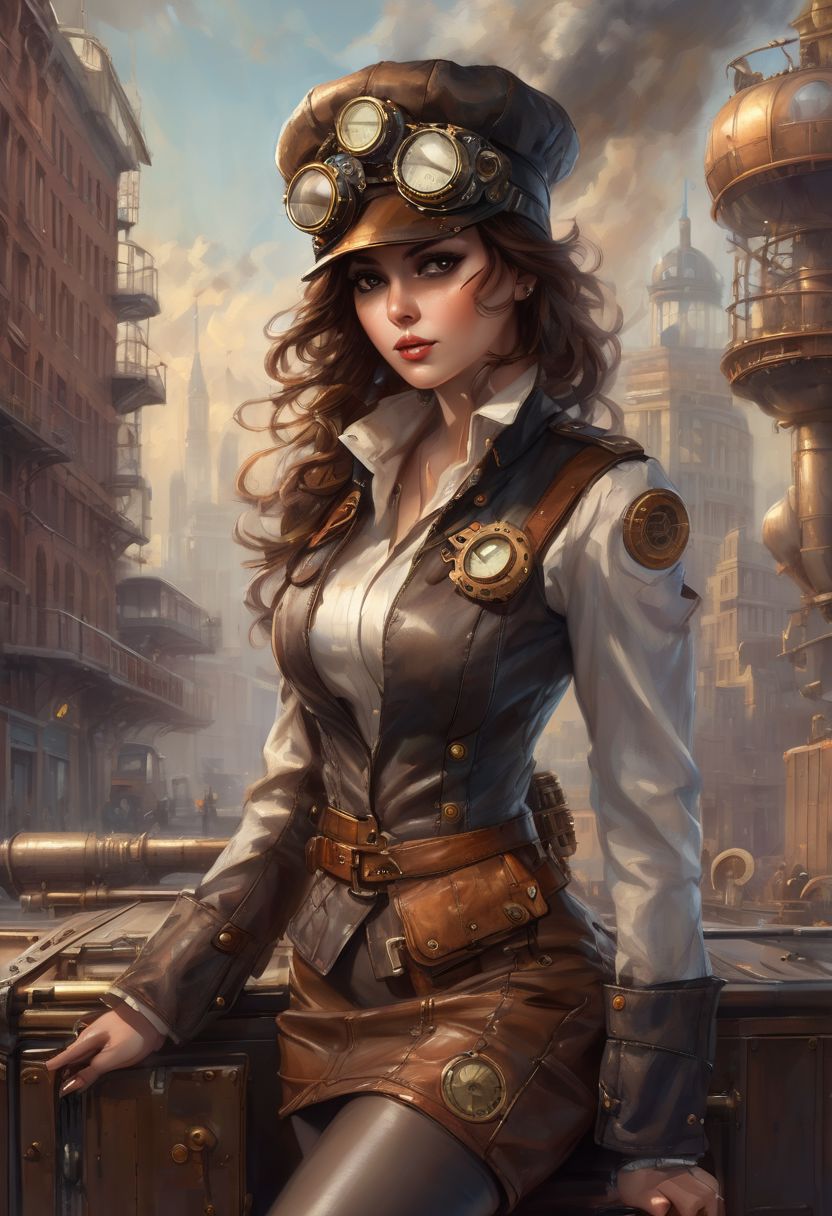 Create a highly detailed, realistic image of a steampunk aviator. The aviator should be a woman in her 30s, wearing vintage pilot gear with brass goggles, a leather aviator cap, and a long trench coat. The background should depict a bustling Victorian-era city with steam-powered flying machines and airships in the sky. Incorporate intricate mechanical details such as exposed gears and steam pipes. The overall atmosphere should be dynamic and adventurous, with a blend of warm and cool tones to emphasize the metallic elements.