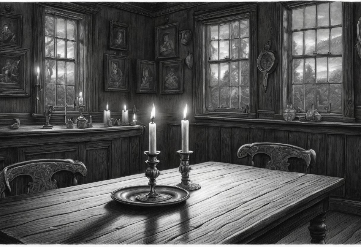 A candle on the table, Inside old tavern, Dark ambiance, oil painting by James Gurney detailed matte painting hyperdetailed charcoal photo, HDR, 4K, ultrarealistic, intricate, hyperdetailed, sharp focus