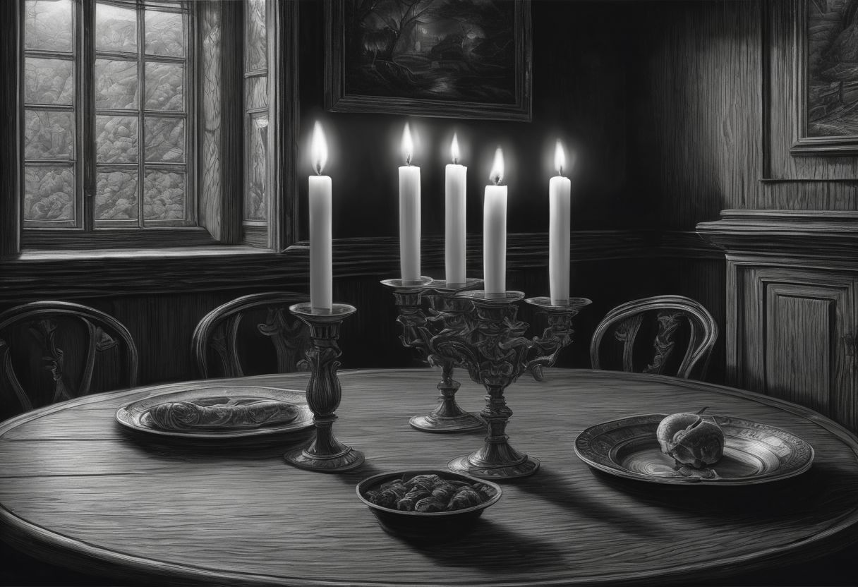 A candle on the table, Inside old tavern, Dark ambiance, oil painting by James Gurney detailed matte painting hyperdetailed charcoal photo, HDR, 4K, ultrarealistic, intricate, hyperdetailed, sharp focus