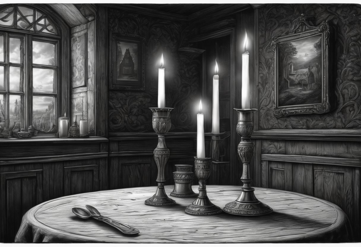 A candle on the table, Inside old tavern, Dark ambiance, photo style as a detailed matte painting hyperdetailed charcoal old photo, HDR, 4K, ultrarealistic, intricate, hyperdetailed, sharp focus