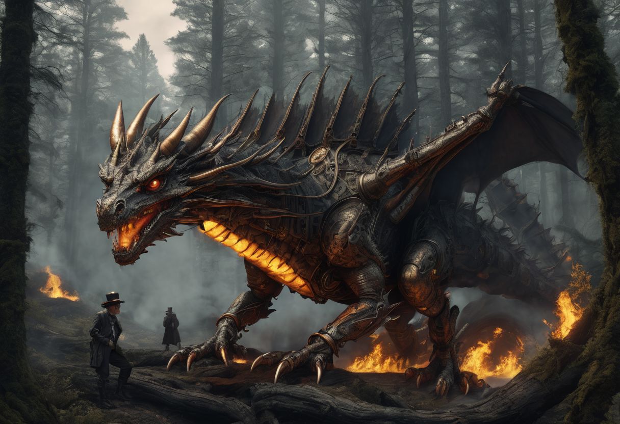 (Steampunk:1.3) dark forest with fire dragon, (detailed matte painting), sinister by Greg Rutkowski, (steampunk engine), hyperdetailed charcoal old photo style, HDR, 4K, ultrarealistic, intricate, hyperdetailed, sharp focus