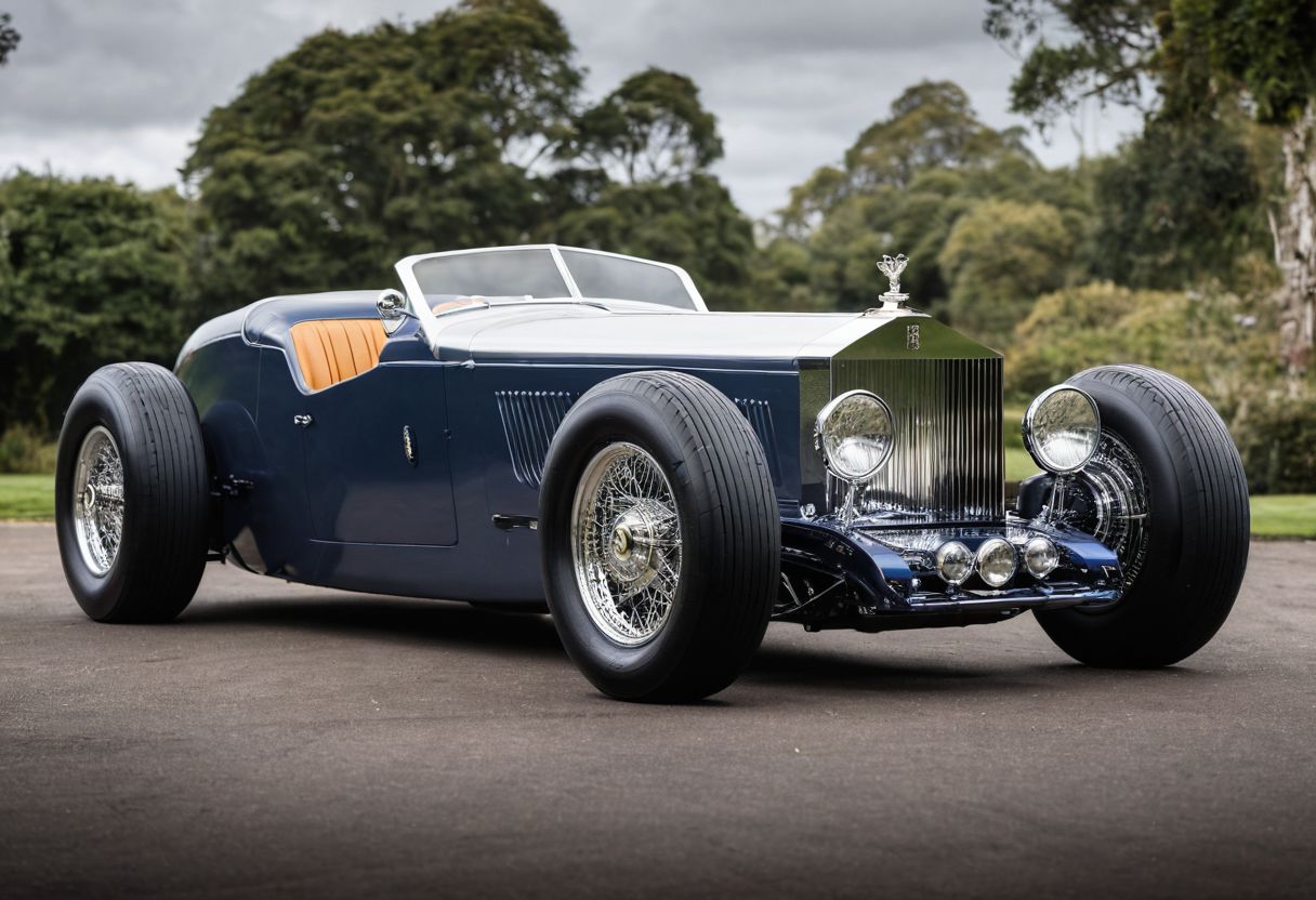 A sleek powerful custom hot rod Rolls Royce racer, stylish, large formula1 tyres