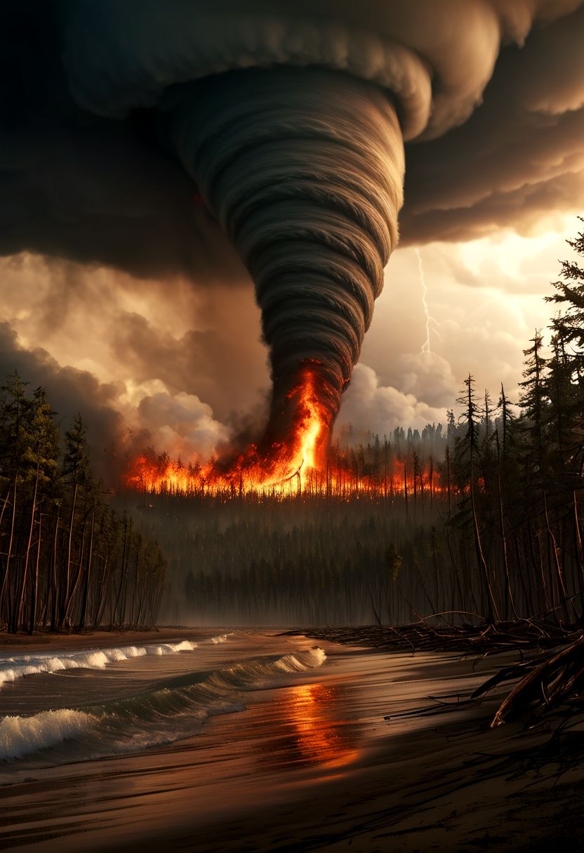 tornado over a burning forest , tsunami on the coast, epic , masterpiece, dynamic, highly detailed