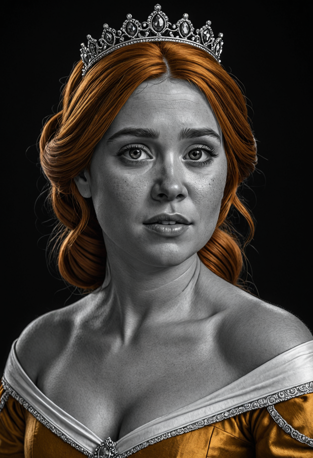 upper body shot, Princess Fiona, black and white image, in the style of hyperrealism and photorealism, precisionist art, emotionally charged scenes, dark amber, vibrant realism, photo taken with nikon d750, elegant realism