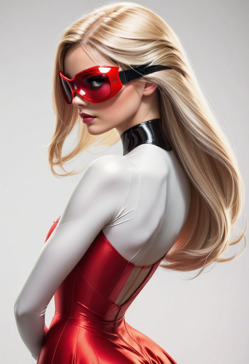 Rapunzel as a Blonde Phantom, red 50s dress, black eye mask, style of stanley artgerm, artgerm style, white background, simple background