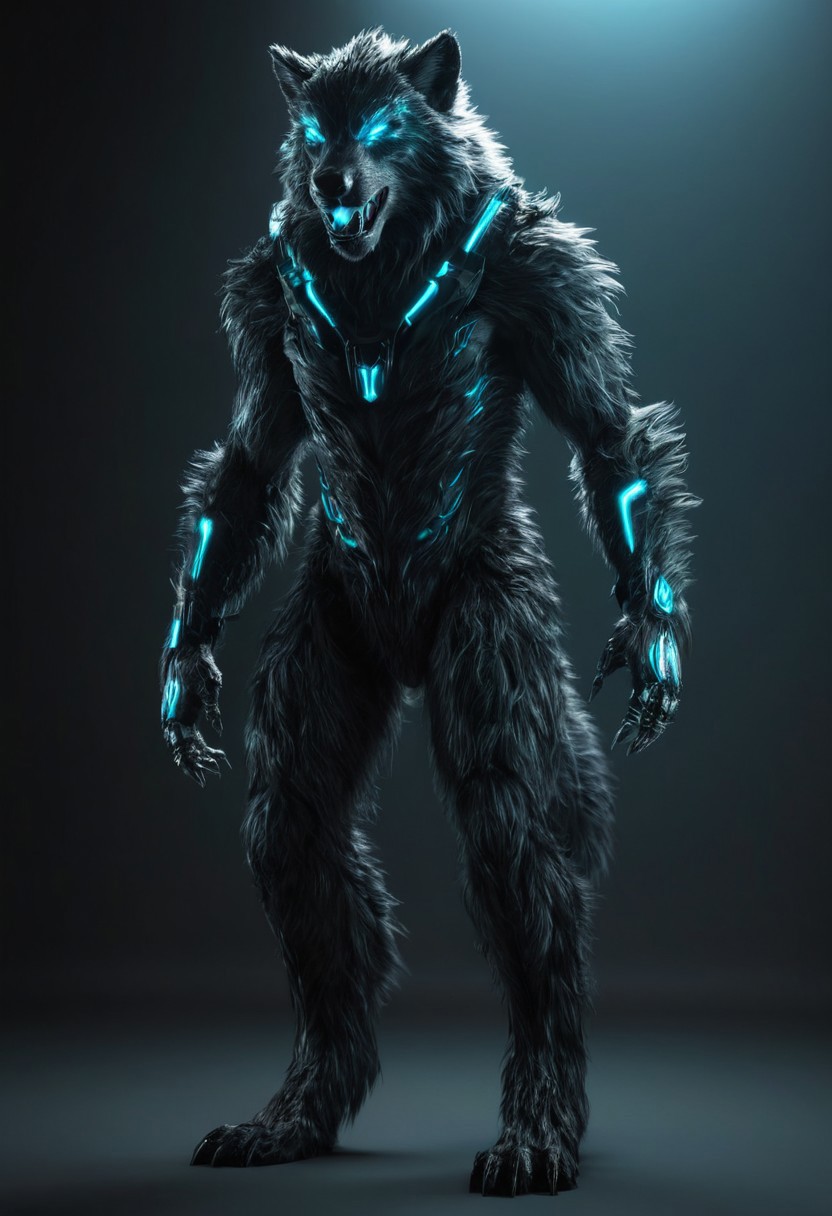 full body realistic fur Werewolf cyborg , glowing, shiny, scifi, neon lights, intricate artistic color, cinematic light, radiant, vibrant, perfect symmetry, Grayscale, Dramatic spotlight, highly color focused, dynamic motion, very dark,