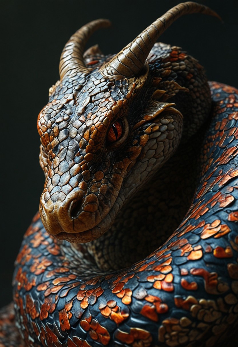 apture a photo-realistic image of a snake with dragon horns, no legs, adorned with black scales featuring intricate red and gold patterning. The snake should have colorful, beautiful eyes and be depicted in a dynamic full-body pose. Utilize cinematic lighting with Rembrandt lighting techniques to create depth and drama in the image. Incorporate volumetric lighting to enhance the atmosphere around the snake. The photograph should be taken with an aperture of F/2.8 to create a shallow depth of field and focus attention on the subject. Ensure maximum detail and ultra-realism in the rendering. The snake should be centered in the frame, commanding attention and exuding beauty and majesty. The overall composition should be visually captivating and show, ((Antro)), ((furry)),ase the intricate details of the snake's scales and horns. (Dramatic Lighting, Photography, 3D Illustration, Vibrant Colors, Exquisite Detail, Award Winning, Stunning) <lora:MJ52:0.5> epiCPhoto