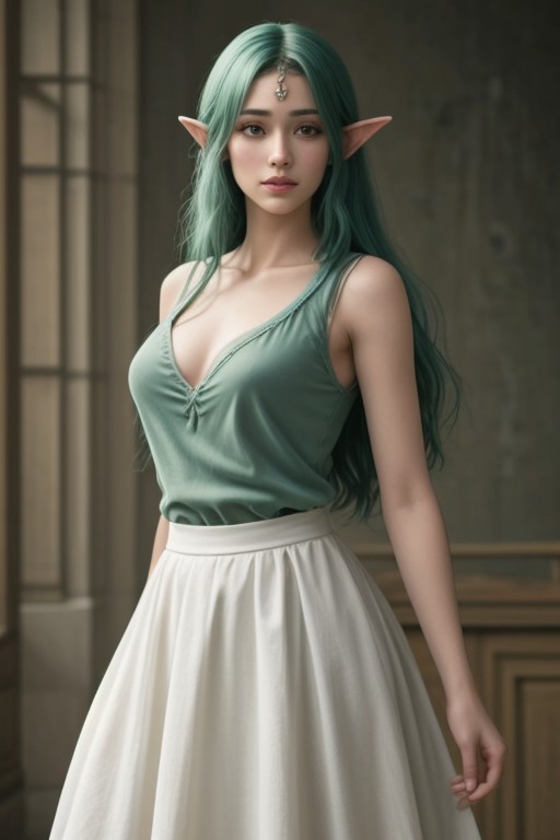 An elf woman with long curly green hair and bangs parted in the middle of her forehead. Wear a bindi on the forehead, armbands on the upper arms, and a white sleeveless dress (long skirt) with a deep V-neck. The left foot is slightly raised, and the left hand is holding the hem of the skirt. FHD, masterpiece, realistic style.