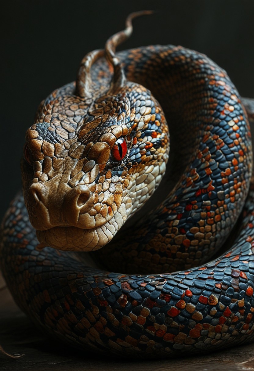 apture a photo-realistic image of a snake with dragon horns, no legs, adorned with black scales featuring intricate red and gold patterning. The snake should have colorful, beautiful eyes and be depicted in a dynamic full-body pose. Utilize cinematic lighting with Rembrandt lighting techniques to create depth and drama in the image. Incorporate volumetric lighting to enhance the atmosphere around the snake. The photograph should be taken with an aperture of F/2.8 to create a shallow depth of field and focus attention on the subject. Ensure maximum detail and ultra-realism in the rendering. The snake should be centered in the frame, commanding attention and exuding beauty and majesty. The overall composition should be visually captivating and show, ((Antro)), ((furry)),ase the intricate details of the snake's scales and horns. (Dramatic Lighting, Photography, 3D Illustration, Vibrant Colors, Exquisite Detail, Award Winning, Stunning) <lora:MJ52:0.5> epiCPhoto