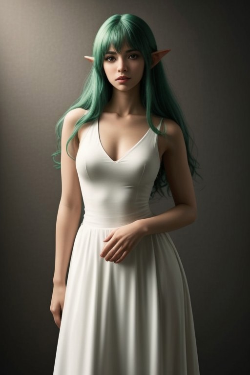 An elf woman with long curly green hair and bangs parted in the middle of her forehead. Wear a bindi on the forehead, armbands on the upper arms, and a white sleeveless dress (long skirt) with a deep V-neck. The left foot is slightly raised, and the left hand is holding the hem of the skirt. FHD, masterpiece, realistic style.