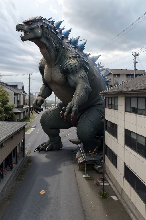 best quality, masterpiece,(solo:1.3), 1monster, gigantic godzilla,(fighter jet:1.4),missile,explosion,extreme long shot bunkajutaku, scenery, power lines, building, utility pole, road, street, tree, window, house, sky, city, day, exterior, outdoors shadow, realistic,
