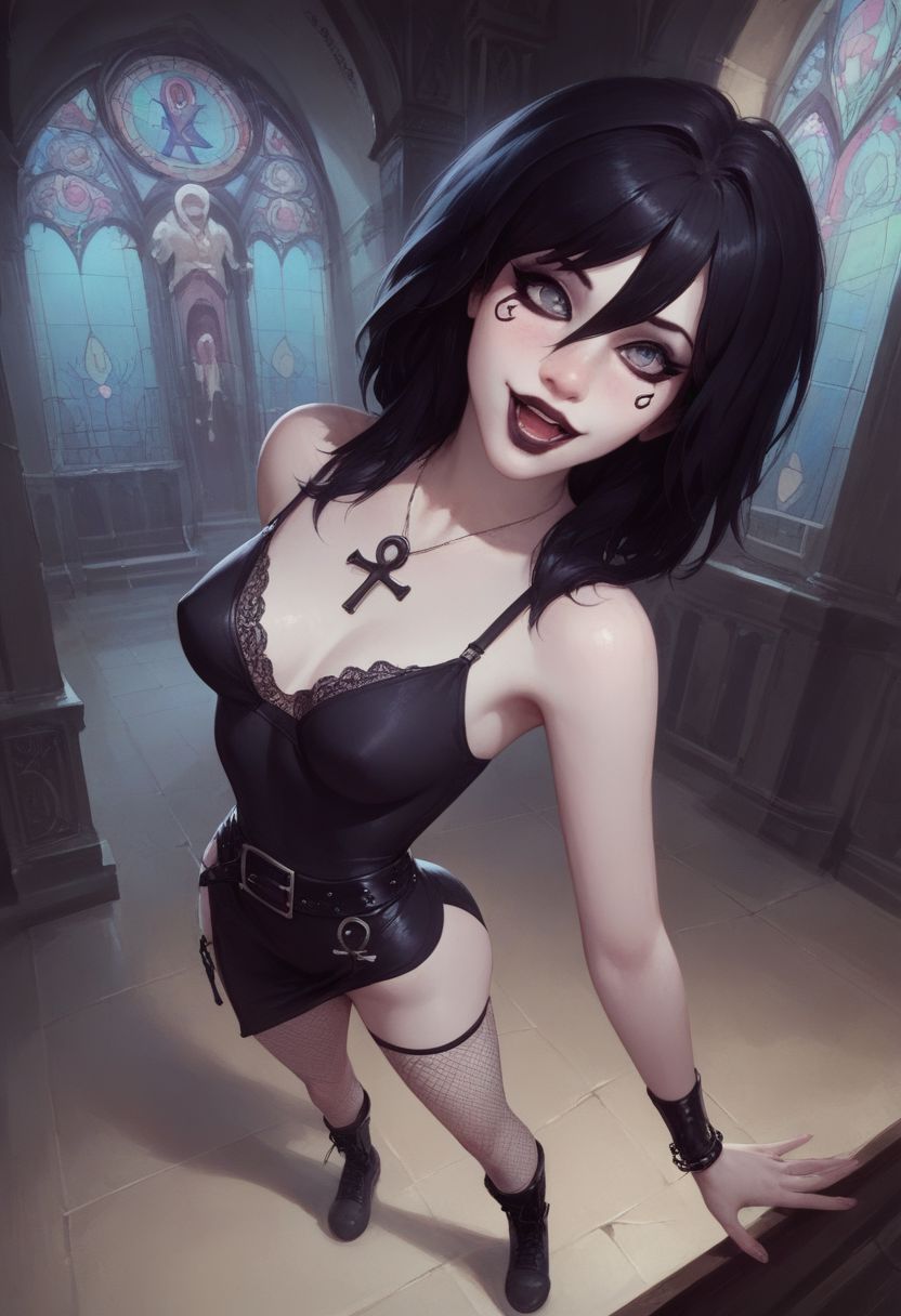 score_9, score_8_up, score_7_up, pinup girl pose, a sexy girl in a goth outfit, (silver ankh necklace), dancing, smiling eyes, mouth open, cleavage, (((fishnet shirt))), black lace bra, black lace skirt, close on face, short black glam hair, egyptian eyeliner, eye of horus, (very pale skin), (((white skin))), pale colors, goth decorations, small breasts, perfect face, thin waist, heart-shaped ass, black themed clothes, mischievous look on face, semi realistic, fantastical, looking at viewer, (black hair), gray eyes, face mark, fishnet stockings, combat boots, black bracelets, full body, from above, focus on face, score_9,score_8_up,score_7_up,very aesthetic ,(masterpiece:1.4), (best quality), (colorful), (detailed) dramatic angle, unique perspective, unique angle, comic book angle and perspective, (((nighttime))), summer night, candle light, D_endless, indoors, at night, in a crypt, stained glass window