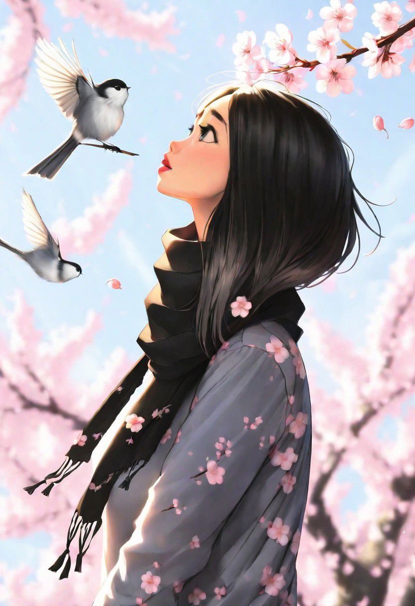 sam yang, 1girl, butterflies, birds, black eyes, black hair, blurry, blurry background, cherry blossoms, lips, long-tailed tit, looking up, medium hair, profile, scarf, solo, tit (bird) , ((masterpiece)) <lora:sam_yang_offset:1>