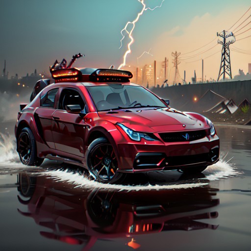 (masterpiece, best quality:1.1), ultra-detailed, (battlecar:1.1), (Vega EVX:0.7), (painted glossy red:1.05), vehicle focus, no humans, car, wheel, tire, debris, splash, sparks, electricity, glowing, water, dirty