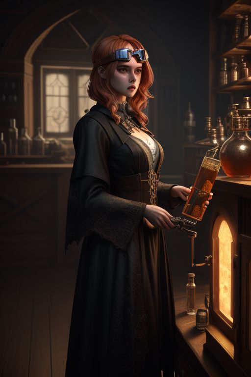 gothic and crazy feminine alchemist brewing hazardous potions in complex scientific instruments, standing in his crowded magic potions shop, she has wild copper color hair and goggles, hyper detailed, surrealism, hyper realistic, extremely complex, gothic, dark, dramatic, hyper realistic, intricate classic art, insanely intricate, masterful, great works of the masters, 8k uhd, octane render, 4k, HDR, dynamic lighting, ultra-detailed, film photography, light leaks, trending on artstation, sharp focus, studio photo, intricate details, highly detailed, by greg rutkowski, ((3d render)), intricately rendered