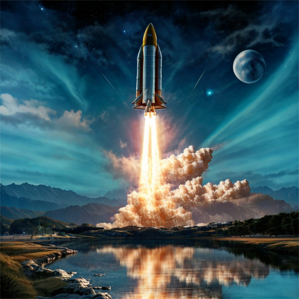Rocket, reflection, lake, water, space, planet, no humans, ground vehicle, cloud, sky, flying, star_\(sky\), city, science fiction , super-reaslitic, 8k, best quality, moon, <lora:rocketStart:0.95>