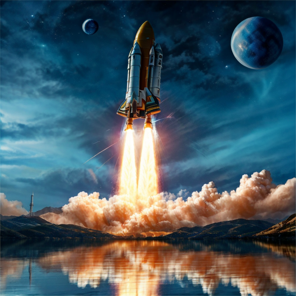 Rocket, reflection, lake, water, space, planet, no humans, ground vehicle, cloud, sky, flying, star_\(sky\), city, science fiction , super-reaslitic, 8k, best quality, moon, <lora:rocketStart:0.95>