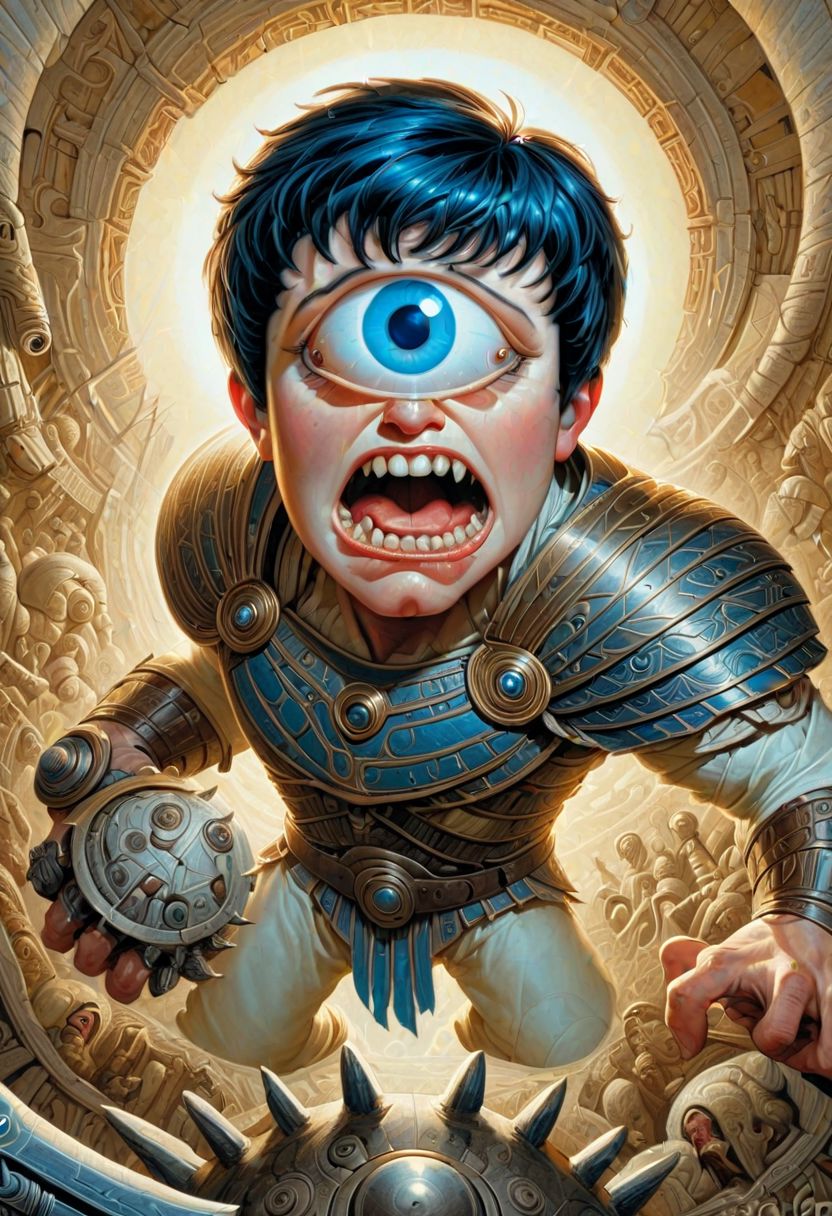 cyclops, one eye, solo, looking at viewer, short hair, open mouth, blue eye,, black hair, 1boy, dressed in armour, by Bill Medcalf and Afarin Sajedi, (luminous , angry , masterful:1.4), poster art, bold lines, hyper detailed, expressive, award winning, (movie still:1.4), (intricate details, masterpiece, best quality:1.4), looking at viewer, dynamic pose, wide angle view, dark limited palette, dramatic lighting,