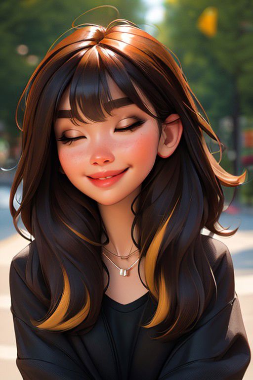 sam yang, 1girl, bangs, black hair, black shirt, blurry, blurry background, bokeh, brown eyes, brown hair, closed mouth, day, depth of field, hair between eyes, half-closed eyes, head tilt, jewelry, lips, long hair, long sleeves, looking at viewer, multicolored hair, necklace, nose, outdoors, shirt, smile, solo, thick eyebrows, two-tone hair, upper body , ((masterpiece)) <lora:sam_yang_offset:1>