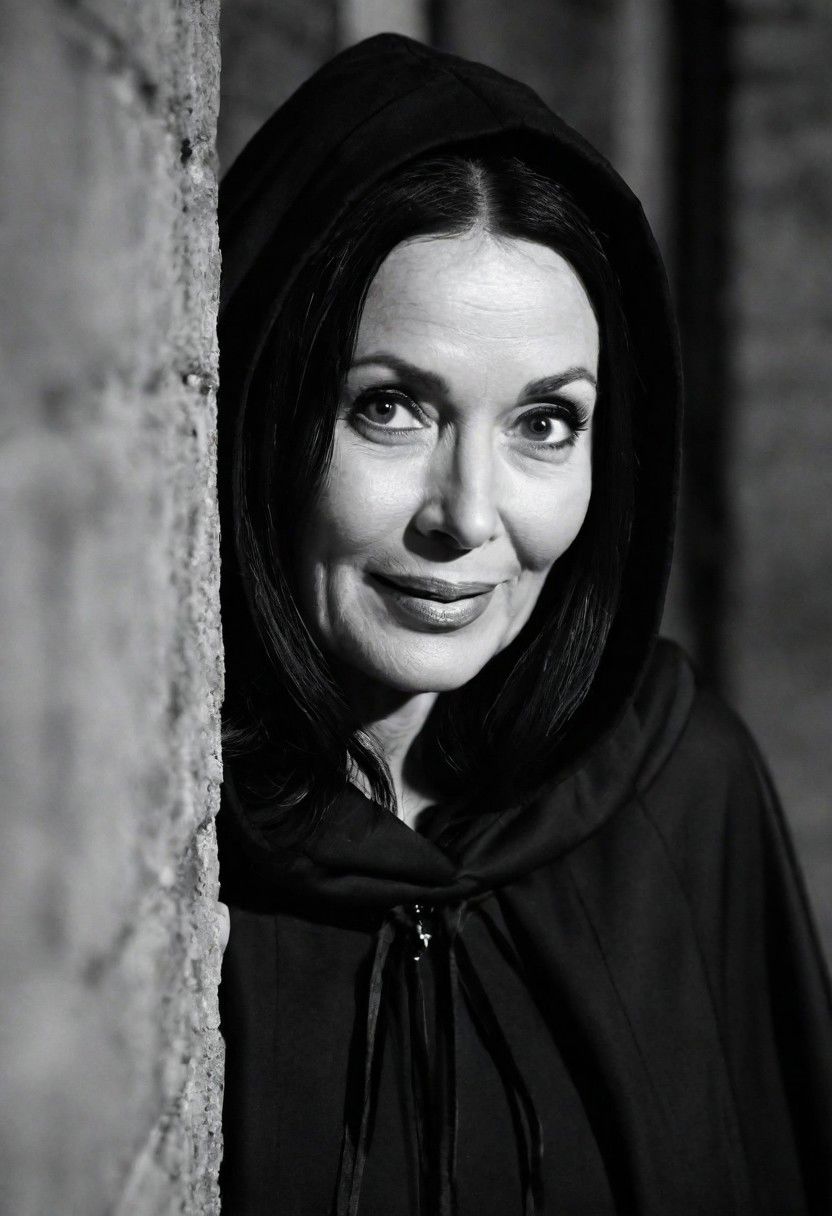 cinematic, ((black and white, monochrome, greyscale)), portrait, of a highly detailed, older woman, (wrinkles:0.1), long black hair, beautiful illuminated eyes, slight smile, black cloak with hood, medium breasts, leaning, against a wall, in a dark, dimly lit, urban alley, at night, she beckons you to follow her, an endless experience of ecstasy and delight awaits and the only cost is just your soul. noise, noisy, detailed, high quality, cinematic lighting, contrast, heavy dynamic shadows, atmospheric,