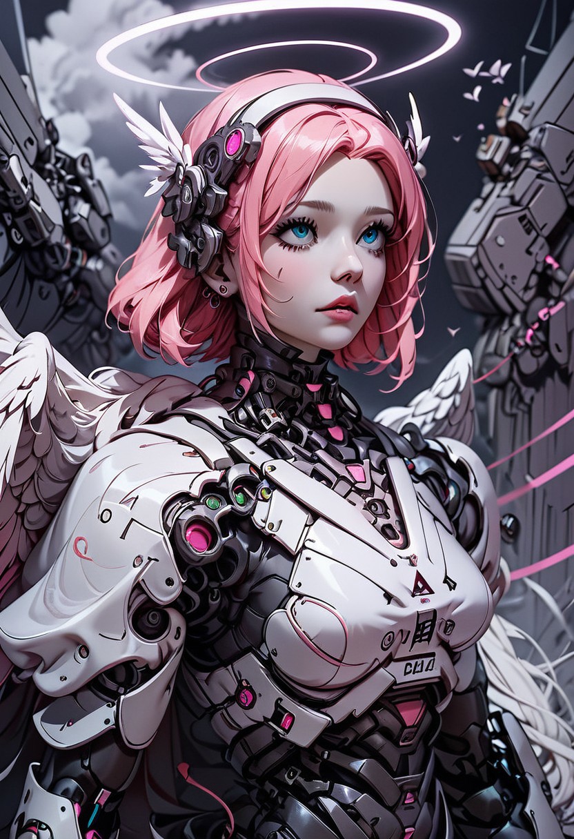 score_9, score_8_up, score_7_up, xenotr1p, (angel), (wings), (white, marble), mcnm, absurdres, (UHD), pure, (halo), holy, pink glow, angelic, Robot Skin, Android Skin, (close up), surrounded by clouds, highly detailed, best quality, masterpiece, digital_art, <lora:Mechanism-pdxl-1:1.0>, composition;(from above, look up)