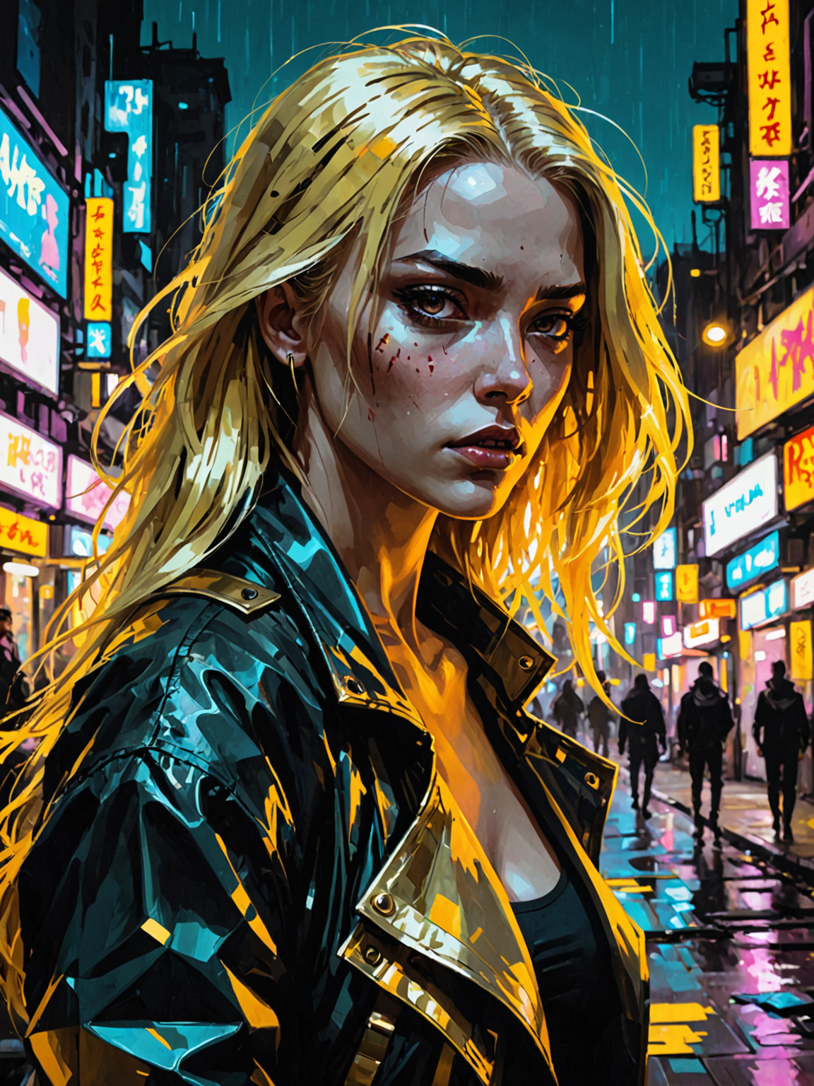 (dark cyberpunk comics style,broad brushstrokes:1.1), woman with loose gold hair in a (cyberpunk:1.1) city,spotlights,rave, (comics drawing using rough brushstrokes:1.1)
