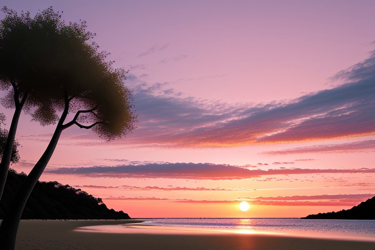 outside, daytime, sunrise, no people, beach, semi-realistic, pink colors