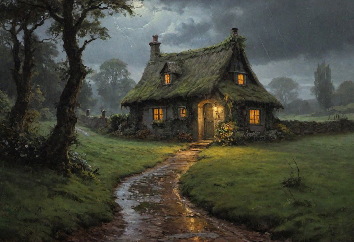muted color, master enticing mood painting with visible paint strokes, imposing best quality, raining landscape painting, 3 point perspective, long spooky scary path to a witch cottage, perfect, 4k quality, masterpiece, best quality, classical lush scifi, oil painting