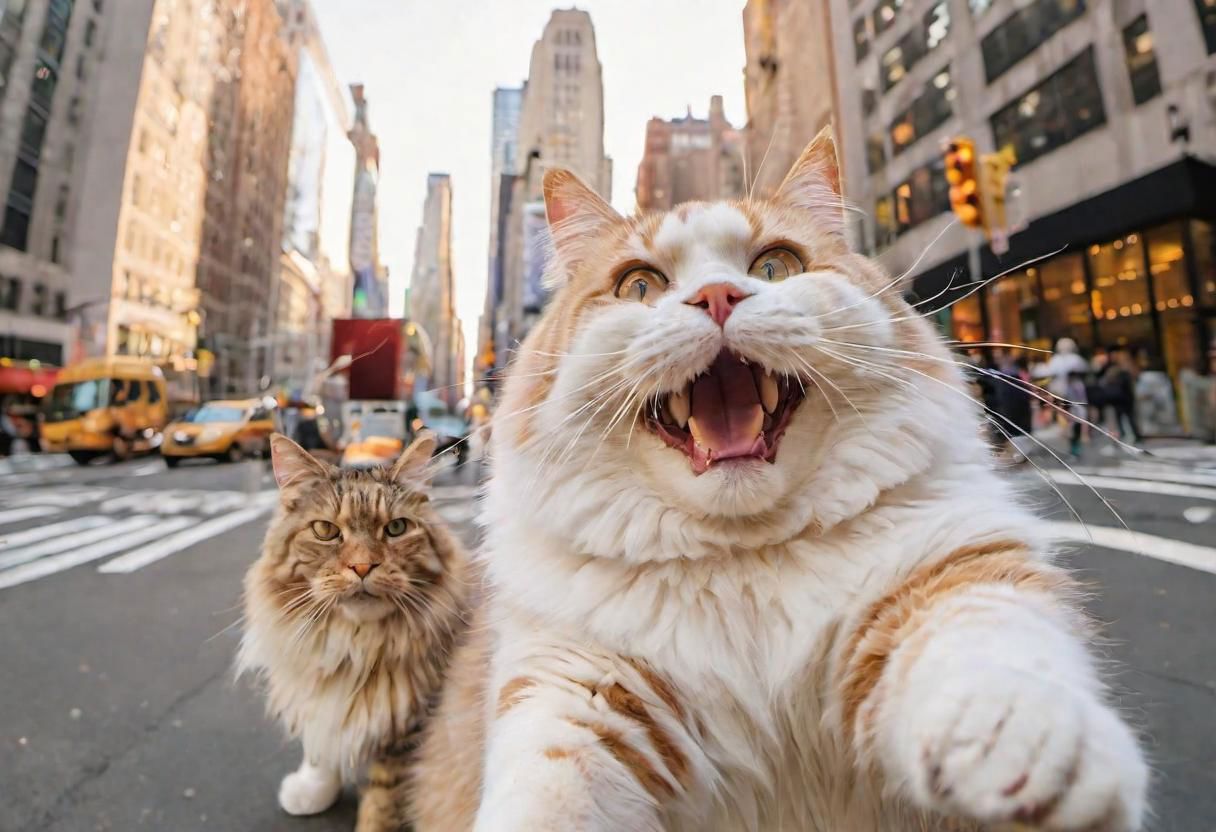 (dogs and a big fat fluffy cat, smiling taking a selfie) with a (super wide angle lenses:0.67). happy vibes, New York city center backdrop. warm lighting. Masterpiece, 8k uhd, iconic, cinematic