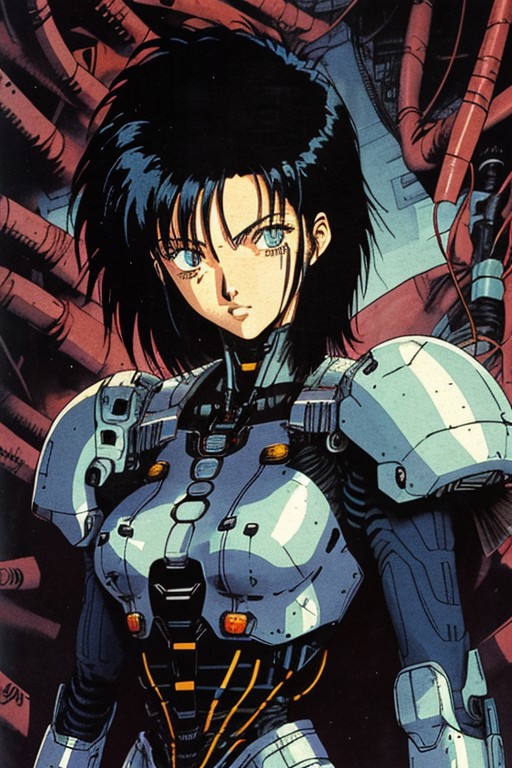 1990s \(style\), retro artstyle, retro anime, very detailed, absurdres, 1girl, solo, fringe, black frizzy hair, upper body, cyborg, android-seams, metal armour, torn jacket, metal bits, complicated hardware, huge wiring background, cyberpunk, (battle angel alita style), <lora:robot-seams:0.6>